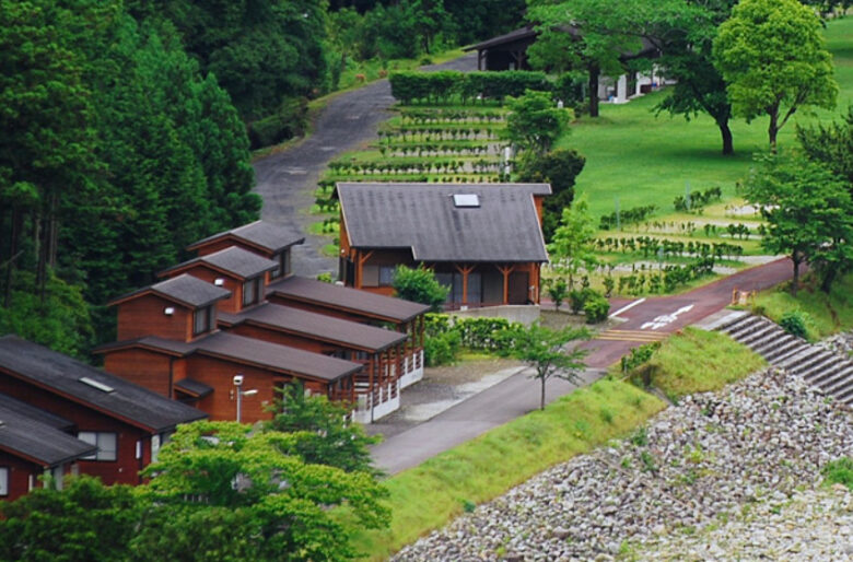 管理棟 売店 炊事場 トイレ シャワー 木工アート広場 炭火焼ハウス コインランドリー 芝生広場 ホタルのビオトープ 川遊び アウトドアサウナ