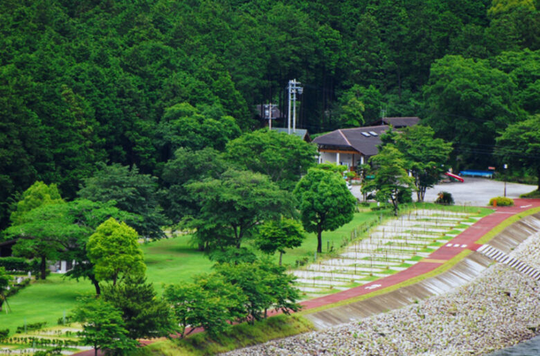 管理棟 売店 炊事場 トイレ シャワー 木工アート広場 炭火焼ハウス コインランドリー 芝生広場 ホタルのビオトープ 川遊び アウトドアサウナ
