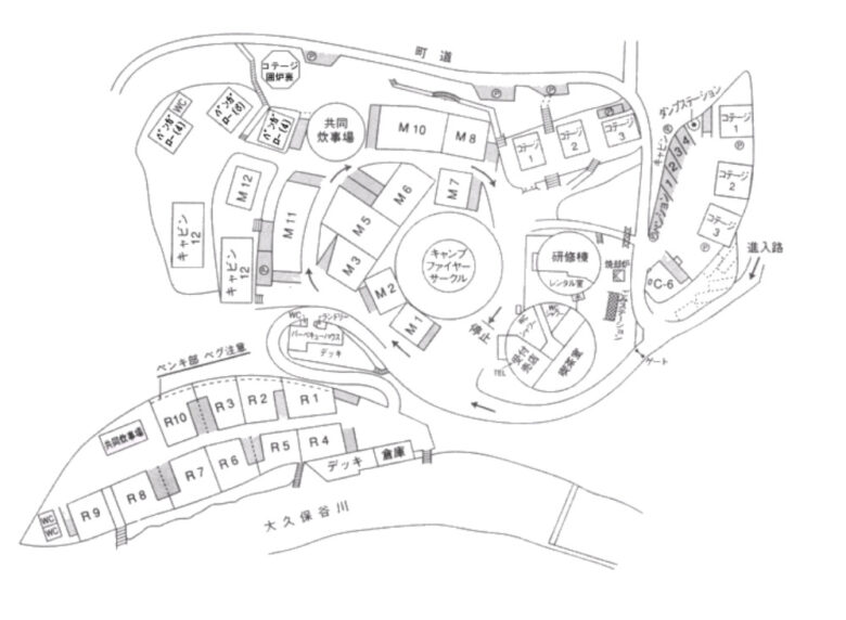 管理棟 売店 炊事棟 トイレ 温水シャワー コインランドリー バーベキューハウス どんぐり教室(陶芸体験 そば打ち体験) キャンプファイヤーサークル 川遊び