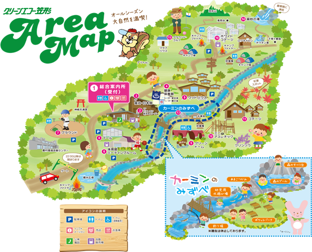 管理棟 売店 レストラン 宿泊施設「日本間(客室)」 研修棟 健康保養館 響の湯 体育館 カーミンのみずべ