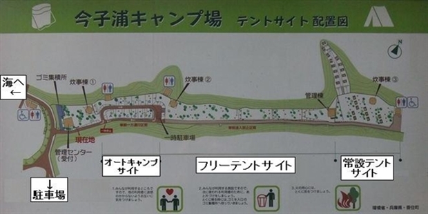 管理棟 水洗トイレ コイン式シャワー 「温水」 炊事棟 水道、洗い場、炊飯用カマド 売店 今子浦海水浴場