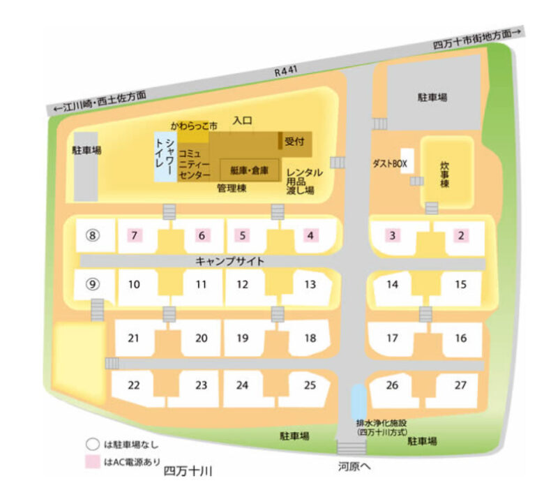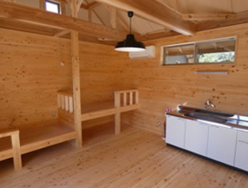 管理棟 炊事場、温水シャワー ランドリー 自販機 トイレ 川遊び アクティビティ