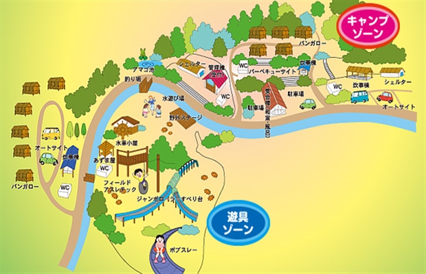 管理棟 トイレ 売店 炊事棟 お風呂 体験教室 フィールドアスレチック ジャンボローラーすべり台 川遊び場