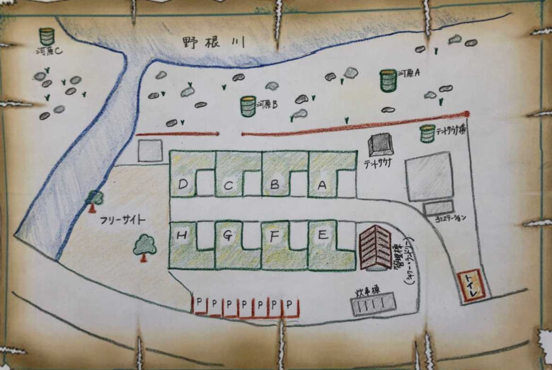 管理棟 炊事棟 自販機 トイレ シャワー ランドリー ドラム缶風呂 川遊び