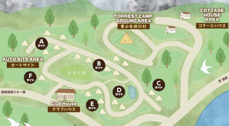 管理棟 売店 自販機 炊事棟 トイレ シャワー室 バーベキューサイト 遊具 ピザ窯 ランドリー ドッグラン 広場