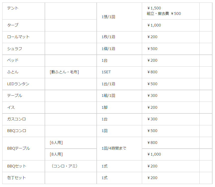 フリーサイト /(繁忙期は簡易区画として約50サイト) ※ 車の乗り入れ可