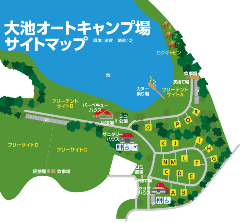 管理棟 炊事棟 自販機 サニタリーハウス バーベキュー棟 トイレ シャワー ランドリー カヌー ミニ公園