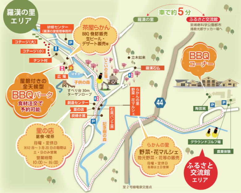 管理棟 炊事棟 トイレ 食堂 自動販売機 キャンプファイヤー場 BBQパーク