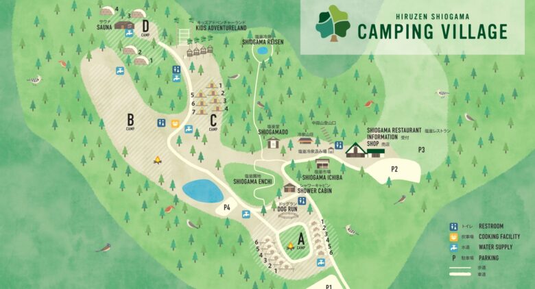管理棟 売店 自販機 レストラン 炊事棟 トイレ シャワー サウナ アスレチック サイクリング ドックラン