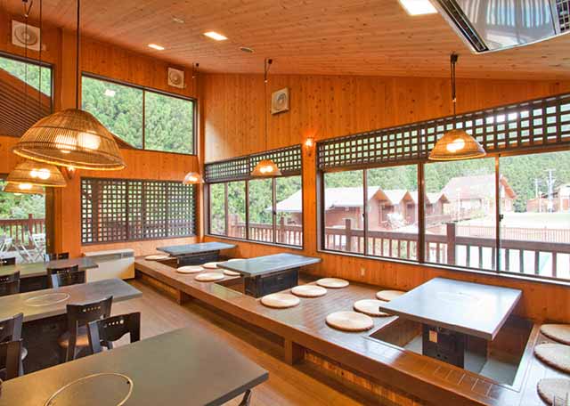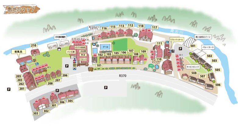 管理棟 トイレ 売店 屋外バーベキュー炉 プール 川遊び 自販機 花火スペース 露天風呂 バレーコート