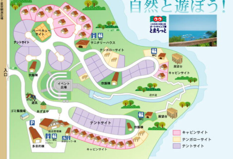 管理棟 売店 喫茶 トイレ 炊事棟 コインシャワー コインランドリー 多目的棟 BBQサイト 展望台 遊具 広場