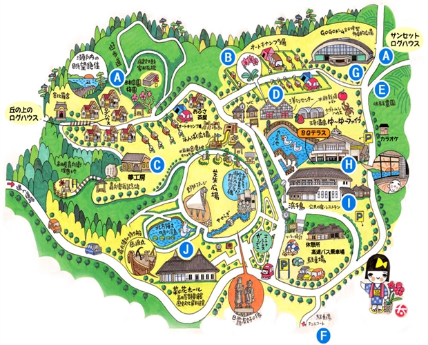 管理棟 トイレ 炊事場 自販機 ランドリー 芝生広場 夢工房 茶屋 レストラン 温泉施設 わんぱく広場