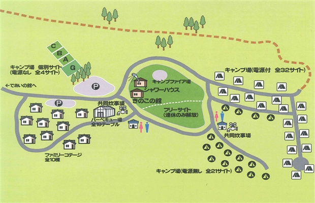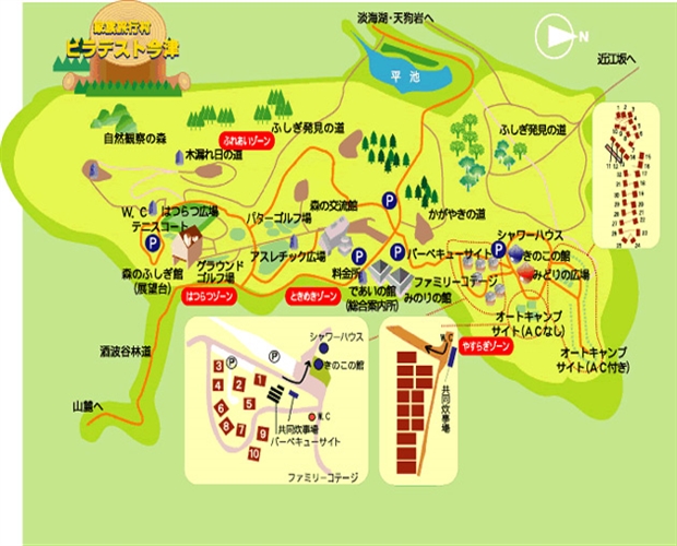管理棟 炊事場 シャワー室 バーベキュー場 トイレ レストラン テニスコート アスレチック広場