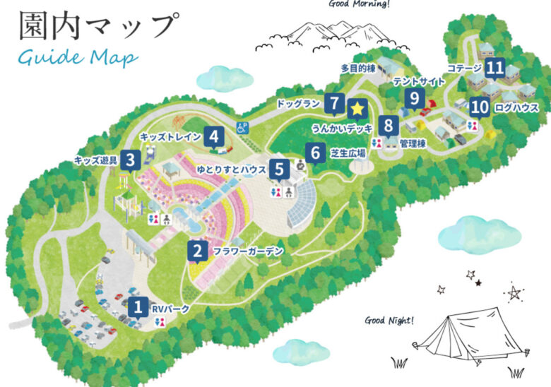 管理棟 売店 レストラン 炊事棟 トイレ 自販機 サニタリー棟 シャワー コインランドリー キッズ遊具 ドックラン 芝生広場